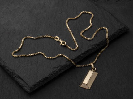 Este elegante colgante de oro macizo de 18 quilates destaca por su diseño minimalista y contemporáneo en forma de lingote trapezoidal. Es una pieza única y singular un adorno ligero y fácil de combinar con otros colgantes. Su silueta geométrica, de líneas limpias y ángulos definidos, aporta un aire de sofisticación moderna que se aleja de lo convencional.